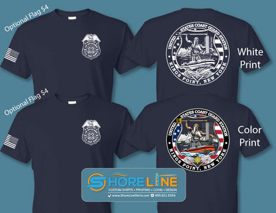 Here are some great examples of apparel made for local establishments as well as the U.S. Coast Guard in White printing and also Color printing. Flag on the sleeves are a nice upgrade as well.